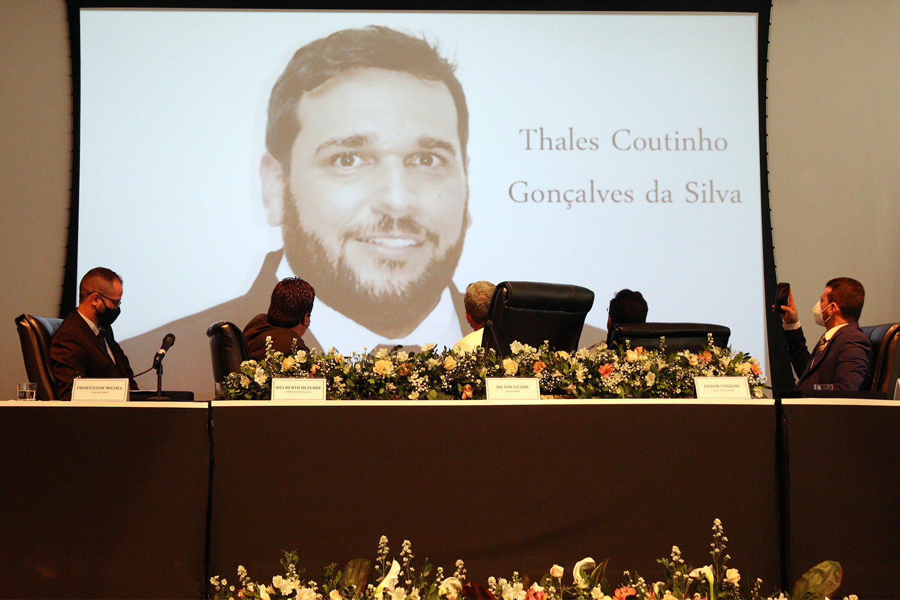 Iza Vicente (Rede) discursou em seguida: “Estou representando a bancada feminina”, disse com bom humor, ironizando o fato de ser a única mulher entre os parlamentares macaenses. Ela recordou os mais de 700 óbitos na cidade e homenageou o colega falecido: “Thales, sua luta não será esquecida”.